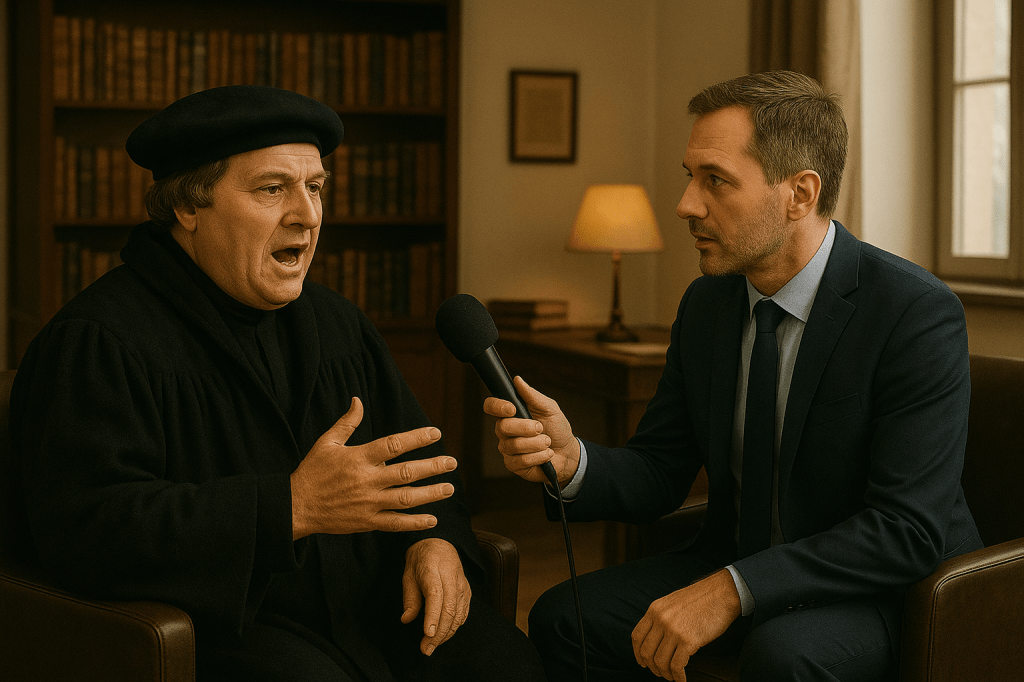 Outubro é mês de memória da Reforma. Em vez de um artigo histórico frio, propomos um exercício pastoral e teológico: uma entrevista imaginária com Martim Lutero. As respostas abaixo foram redigidas em linguagem contemporânea, mas inspiradas nos grandes temas da obra de Lutero – justificação pela fé, sola Scriptura, teologia da cruz, sacramentos e vocação.